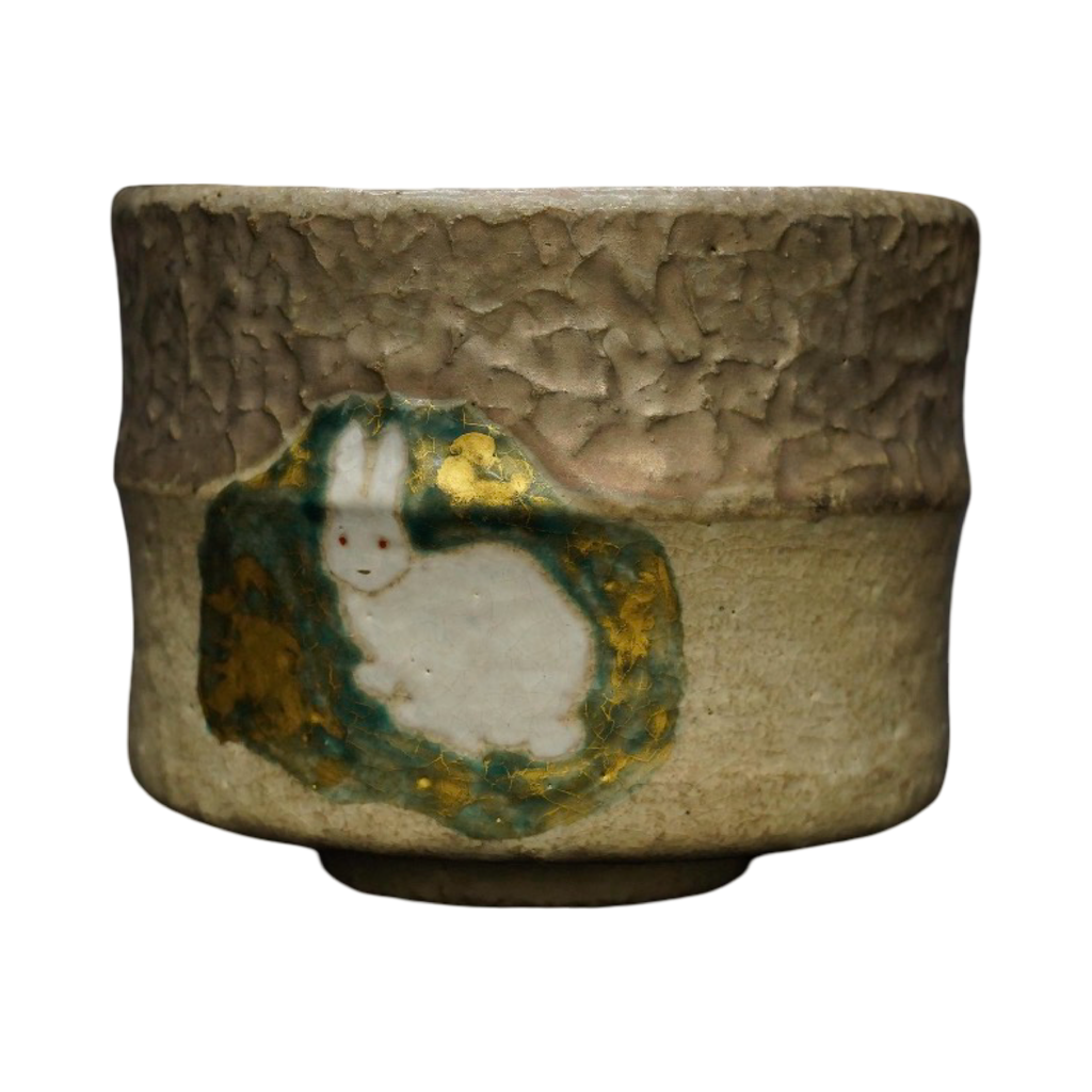 This charming chawan (matcha tea bowl) features a hand-painted rabbit (usagi) motif accented with shimmering silver and gold tones (ginsai), making it a whimsical and elegant addition to any tea ceremony collection. The surface combines rustic textures and natural tones with an endearing white rabbit nestled within a colorful glaze patch, symbolizing good fortune and purity in Japanese culture.